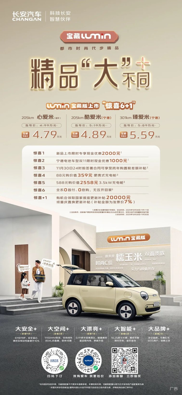 10月30日,都市时尚代步精品,Lumin宝藏版正式上市,共推出心爱米、酷爱米、臻爱米三个配置,官方惊喜价4.79万-5.59万。为回馈用户,Lumin同步推出极具诚意的“惊喜6+1”大礼,购车门槛大幅降低。