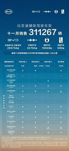 近日,比亚迪公布了其搭载天神之眼辅助驾驶系统的车型在11月的销售数据,全月销量达311267辆,继续引领市场。其中,比亚迪王朝与海洋系列贡献265734辆,方程豹、腾势、仰望等高端及个性化品牌亦表现稳健,共同构筑了比亚迪在智能驾驶领域的强大产品矩阵。