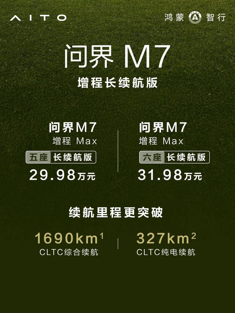 同日,全新问界M7增程长续航版正式上市,其中增程Max五座长续航版售价29.98万元,增程Max六座长续航版售价31.98万元,即刻下定,可享受至高60000元购车权益。