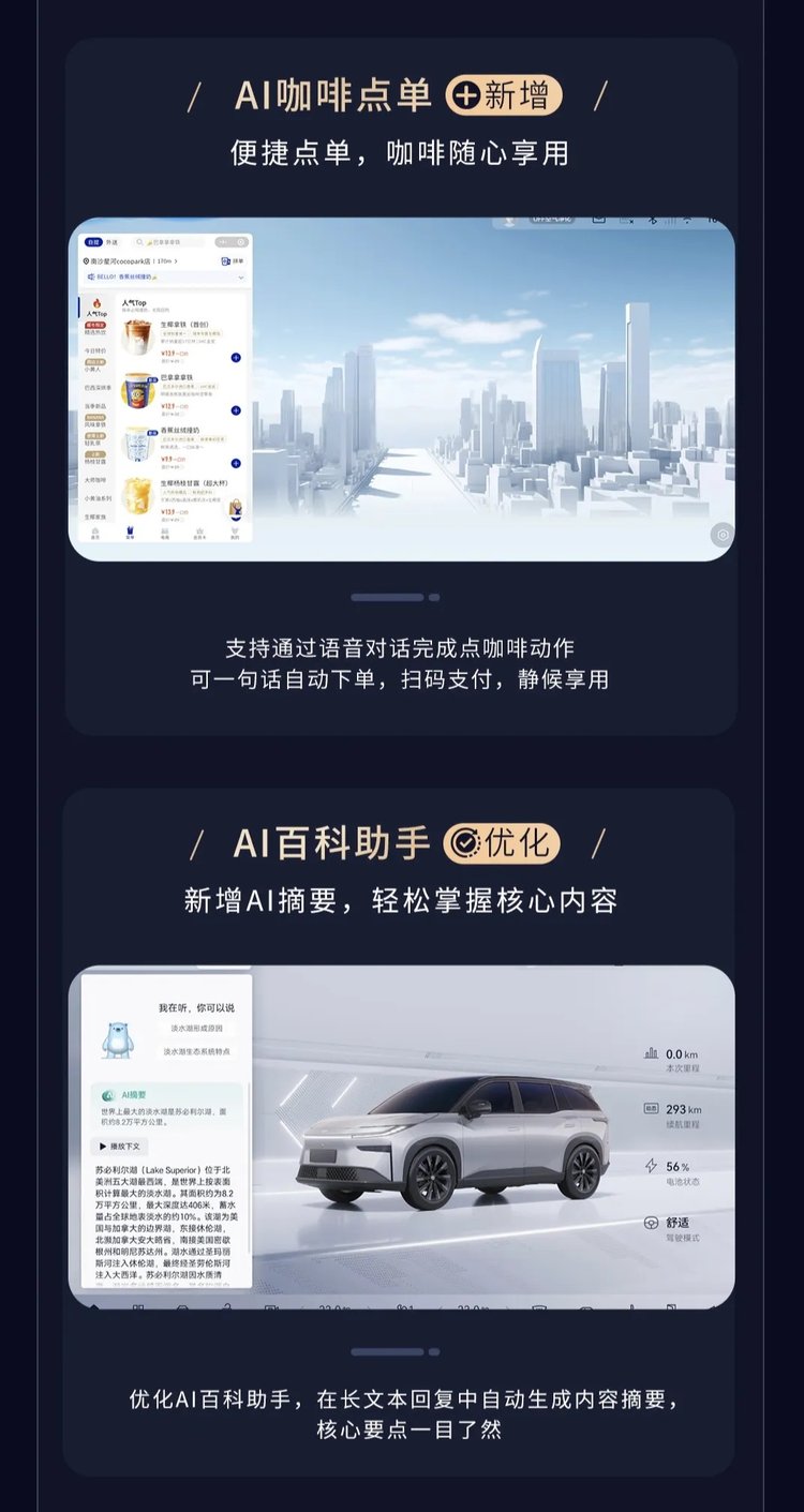 AI绘画、AI摘要、20+微信小程序全上车,短视频、小游戏随手玩,任务管理器和内存管理器加持下,车机运行丝滑流畅,再也没有加载半天的尴尬。从日常互动到生活服务,座舱就像一个贴心的随行管家,把用车场景变得更丰富、更便捷。