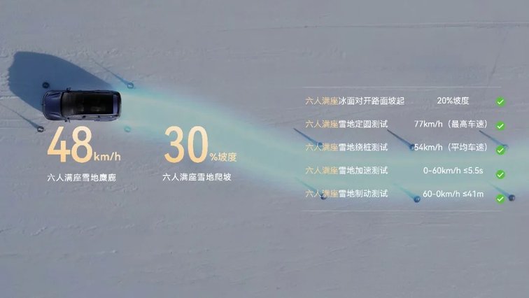 动力上搭载灵犀动力3.0与智能适时四驱,综合功率386kW,峰值扭矩620N·m,百公里加速进入5秒级。四驱版馈电油耗6.98L/100km,两驱版低至5.98L/100km,满油满电续航超1100km,兼顾强劲性能与低用车成本。雪地麋鹿测试中,六座满员状态下仍达到48km/h优异成绩,操控稳定可靠。