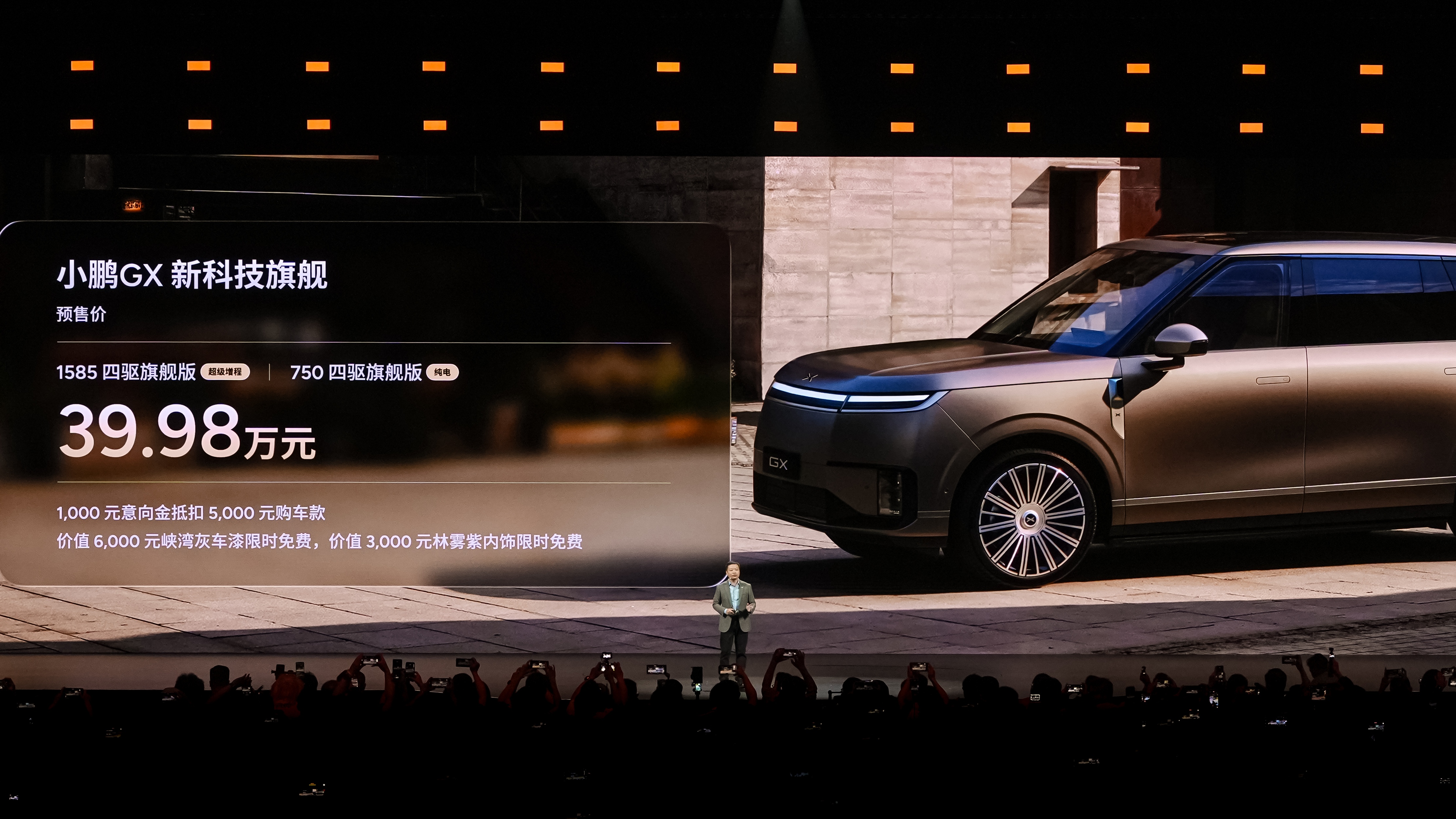 【2026 年 4 月 15 日,深圳】今日,小鹏汽车首款全尺寸旗舰SUV—— 小鹏GX重磅亮相并正式开启预售,新车带来纯电和超级增程两个版本,预售价39.98万元。小鹏GX纯电版四驱纯电续航高达750km;超级增程版纯电续航430km,综合续航1585km。即日起至小鹏GX上市日,用户可享预订限时权益:1000元意向金抵扣5000元购车款,价值6000元的峡湾灰车漆、价值3000元的林雾紫内饰限时免费。