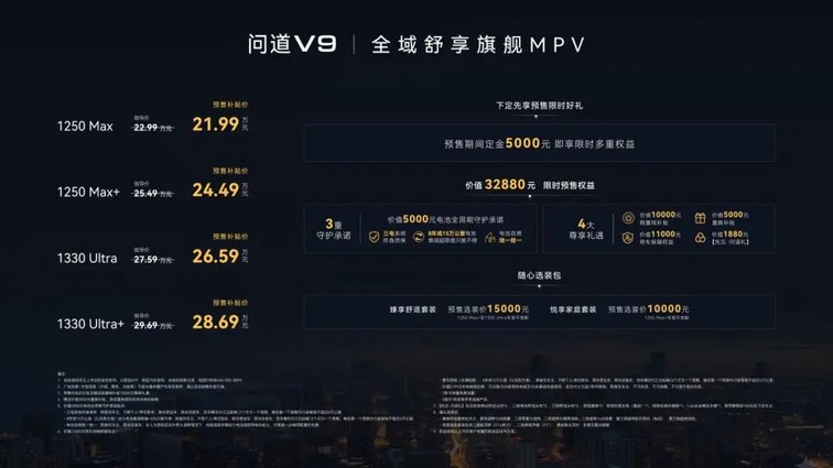 问到了!极狐问道V9真的来了,实力与诚意“夯爆”了。4月28日,极狐问道系列发布暨问道V9预售发布会盛大启幕,北汽极狐旗下首个高端产品系列“问道”正式面世,专为大型旗舰车型而生的泰岳平台同场发布。与此同时,作为泰岳平台赋能的“问道”系列首款产品,全域舒享旗舰MPV问道V9正式开启预售,共推出1250Max、1250Max+、1330Ultra、1330Ultra+共4款版型,预售补贴价21.99万元-28.69万元。凭借旗舰气场、旗舰底盘、旗舰舒享、旗舰安全、旗舰驾控、旗舰续航等十大旗舰价值与诚意满满的预售价格权益,极狐问道V9给用户带来50万级体验,成为旗舰MPV市场“夯爆”的高端出行新选择。
