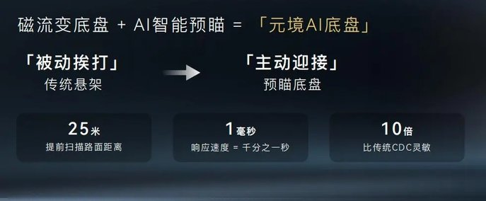 稳定性上,泰岳平台死磕技术工程,通过“磁流变底盘+AI智能预瞄”,打造元境AI底盘。区别于传统悬架的“被动挨打”,元境AI底盘实现“主动迎接”。摄像头和雷达会提前扫描车前方 25 米左右的路面,通过 AI 模型准确区分减速带、甚至道路接缝或碎裂凸起,传递到悬架,悬架里的磁流变液会在磁场激励下,在 1 毫秒的时间内改变硬度。在车轮轧上去之前,悬架就已经做好了准备。