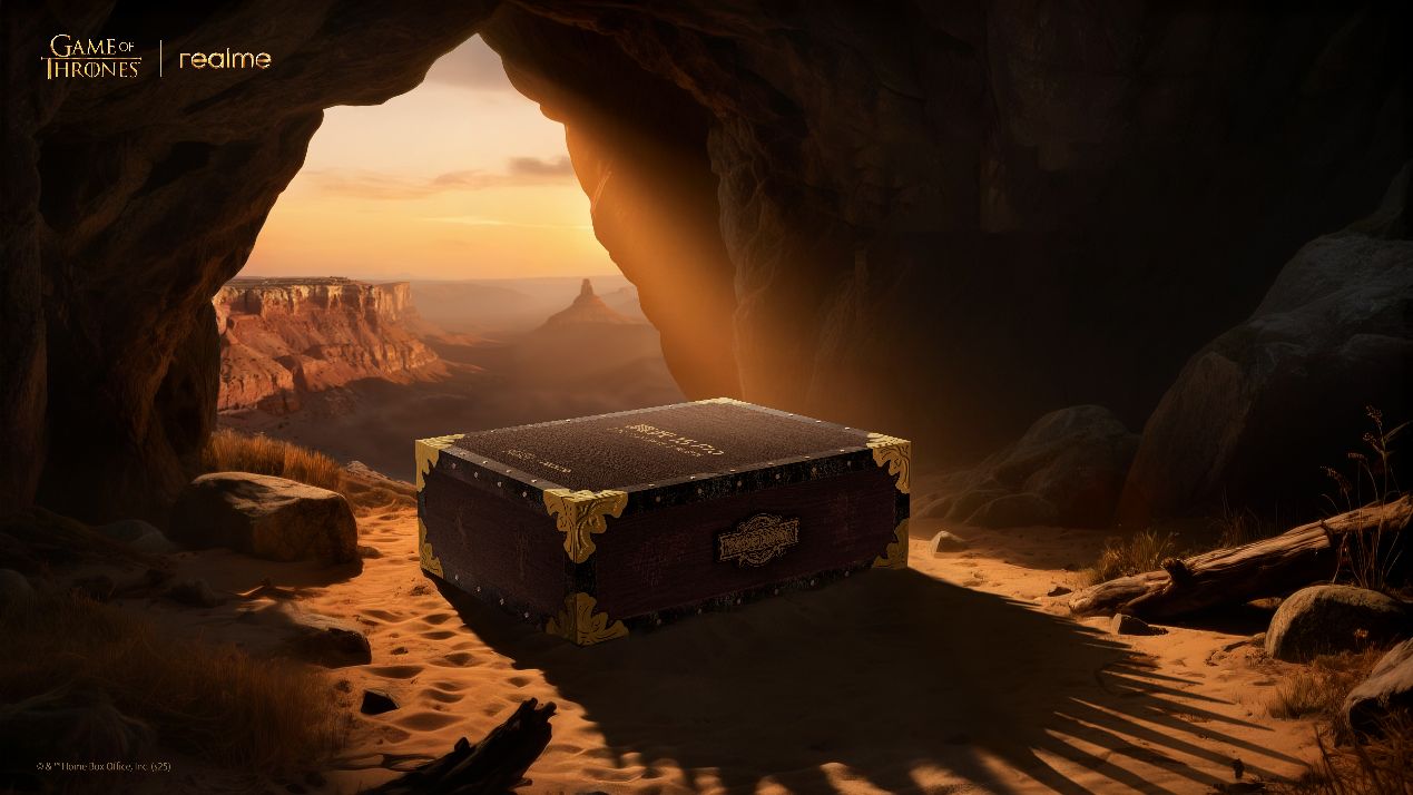 在礼盒周边设计上,真我深度结合原作经典符号,让每一项配置都极具收藏价值。礼盒外观灵感源自丹妮莉丝·坦格利安的龙蛋木盒,以鎏金雕刻纹理呈现,融合质感胡桃木纹理与金属装饰,表面镌刻九大家族徽章,尽显中世纪皇室的厚重感。开启礼盒,便是开启一段荣耀征程,内部直指维斯特洛大陆的最高权力图腾——以立体铁王座造型打造的手机支架,底部复刻完整的维斯特洛大陆地图,让每一次放置都充满仪式感。