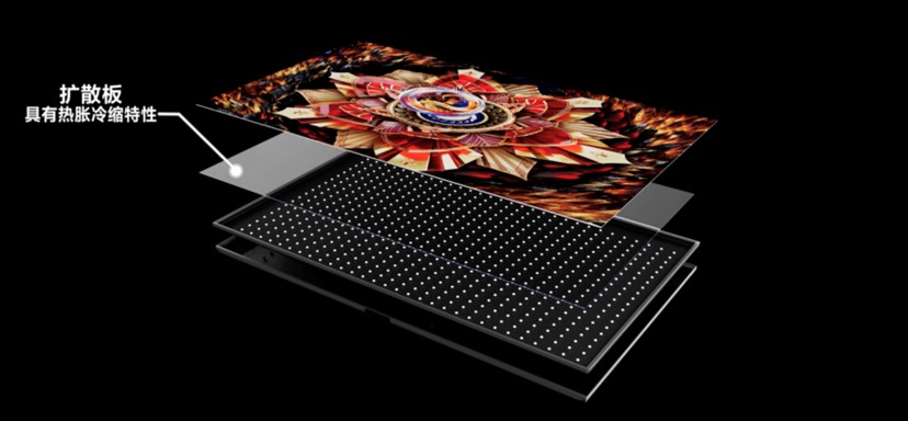 举个例子,电视屏幕下方的模组中有一层扩散板,由于热胀冷缩的材料特性,当电视开机关机产生温度变化时,这块扩散板材会产生伸缩形变,可以理解为“会呼吸的零件”。以前的电视必须在屏幕的四周要留出足够的黑边和边框区域来包容它的热胀冷缩的范围,相当于给扩散板套上"宽松外衣"。因为一旦扩散板遇冷收缩进入到显示区域,四周就会出现漏光;热胀到黑边区域以外,就会顶到边框,产生外观形变。这种"穿宽松外衣"解决方案虽然规避了漏光和鼓包风险,却让屏幕有效显示面积造成损失,极大影响看电视的视觉感受:未开机状态哪怕电视外边框看着再窄,一开机显示画面时,直观感受黑边框仍然很宽。