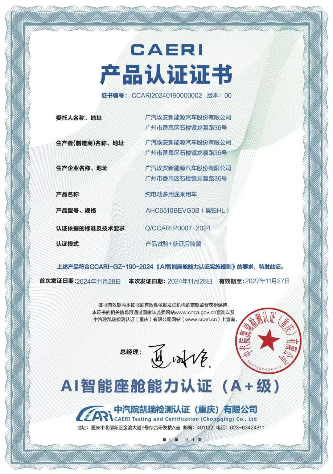 在智能化浪潮的推动下,昊铂以其卓越的科技创新实力,再次站在了汽车行业的前沿。2024年12月5日,昊铂品牌荣耀加冕,其旗舰车型昊铂HL荣获由中汽院凯瑞检测认证(重庆)有限公司颁发的“AI智能座舱能力A+级认证”。