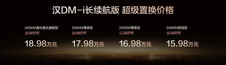 此次,汉DM-i长续航版共推出4款车型,补贴后售价15.98万~18.98万元;汉EV长续航版共推出3款车型,补贴后售价17.38万~20.58万元(10月31日前完成购车可享1万元超级置换补贴)。同时,比亚迪还为用户准备了包含置换补贴在内的至高价值3.8万元七大礼遇。