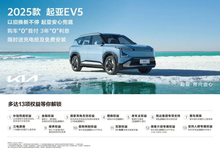 EV5是起亚首款在中国首发、中国生产并销往全球的战略车型。2025款EV5起售价14.98万元,新车不仅增配不加价,还可享至高13项超值购车权益,包括以旧换新补贴取消地区,补贴兜底权益、0首付,3年0息(金融贴息至高23,000元)、赠送充电桩及免费安装服务(价值4,000元)、7,000元增换购补贴、起亚老车主购车赠2年交强险(2,600元/2年)、悦达集团5,000元购车抵扣券、整车5年或10万公里质保、三电8年或15万公里质保、5年5次基础保养材料免费、价值3,000元APP积分首购特别权益、5年免费无限全数据流量、保客介绍专属权益可获1,000元APP积分(介绍人&购车人同享)、定向人群购车即享2,000元充电卡等优惠。