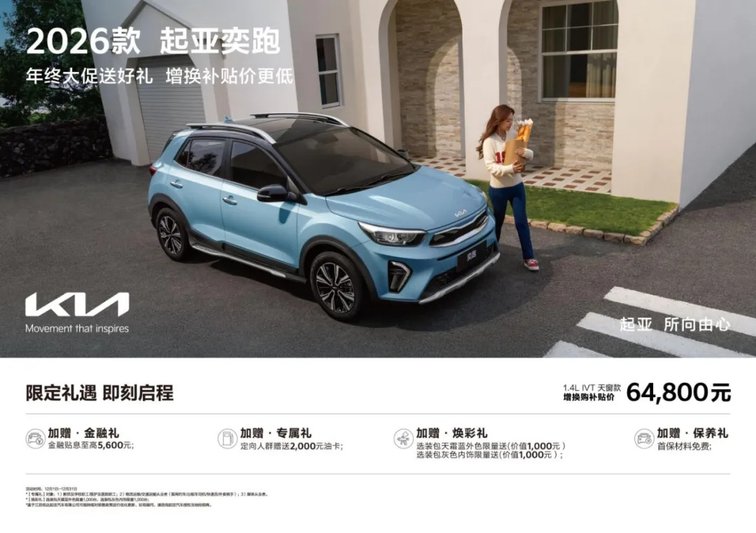 12月31日前,消费者购买2026款起亚赛图斯可享“年末大促价+增换购补贴价”,以官方指导价129,900元的1.5L豪华舒享版为例,增换购补贴价仅需85,900元,消费者购车另享至高8,500元金融贴息、定向人群赠送2,000元油卡、起亚品牌老车主增换购至高2,000元补贴,以及5年5次基础保养材料免费等权益。