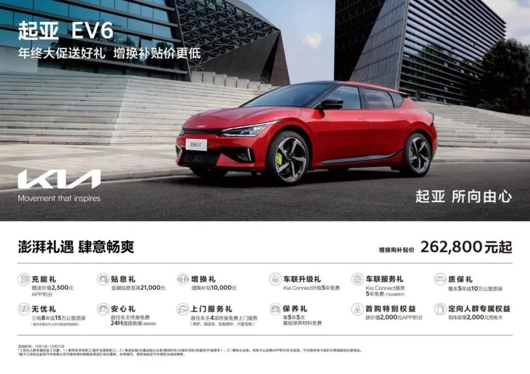 此外,消费者购买“高能纯电轿跑”EV6可享价值2,500元APP积分、金融贴息、增换购补贴、5年免费Kia Connect服务等12项权益,增换购补贴价262,800元起。