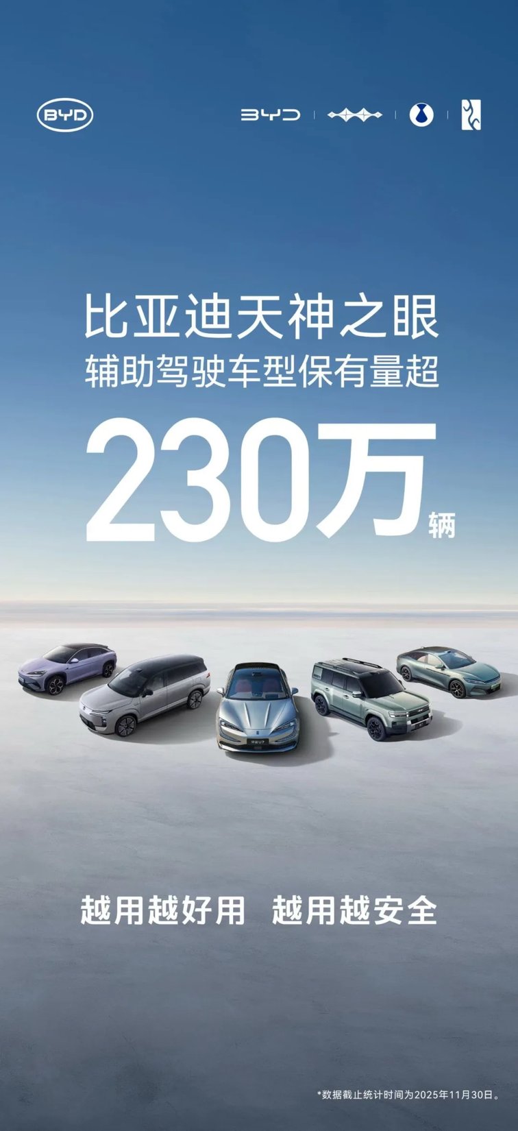 数据显示,截至2025年11月底,比亚迪搭载“天神之眼”驾驶辅助系统的车型累计销量已突破230万辆,持续蝉联中国辅助驾驶车型销量及系统装车量榜首。这标志着比亚迪推动的“全民智驾”战略已取得显著成效,智能驾驶正从高端配置加速向主流市场普及。