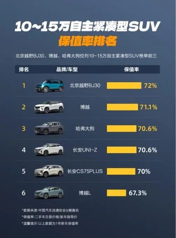 保值率方面,北京越野更是遥遥领先,根据中国国际贸易促进委员会汽车行业分会汽车金融暨保值率研究委员会发布的“硬派越野非承载式SUV保值率排名”榜单,北京越野BJ40以50.28%的3年保值率强势登顶,进一步印证了其在产品力、用户口碑与长期价值层面的全面领先。根据中国汽车流通协会和精真估联合发布的《2026年2月中国汽车保值率研究报告》显示,北京越野BJ30在10-15万自主紧凑型SUV市场以72%的保值率位居榜首。
