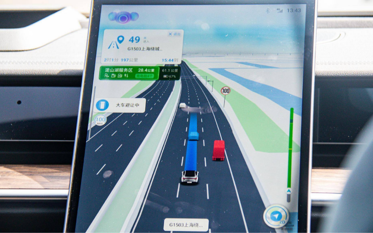哪吒S接近大车时会在不变换车道的前提下,主动向一侧避让,并提速超越大车,完成后还会主动回到车道中心位置。