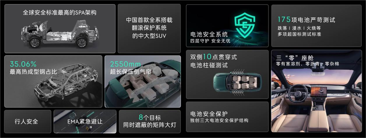 延续品牌基因,提供全域安全。新09EM-P延续了领克对安全的持续关注,基于全球安全标准最高的原生豪华车架构SPA架构,以全球五星安全标准研发、以全域安全理念打造,提供更可靠的原生安全。新09EM-P拥有超长铝合金前防撞梁、同级最长的L113长度和同级唯一的前后热成型钢纵梁结构,结合SPA架构特有的安全保护技术,全方位提升车辆安全保障。车身采用同级最高的35.1%整车热成型钢占比,强度更高。全系标配中大型SUV中仅有的带动态遮蔽功能前大灯,让黑夜行车更有安全感;车辆翻滚保护系统和EMA紧急避让辅助系统可在各种危急时刻为驾乘者提供保护;以安全为第一前提的NOA驾驶辅助功能,让驾乘更轻松安全。此外,新09EM-P还有三“0”健康座舱和电池安全系统,真正实现结构安全、设计安全、用料安全、三电安全的全域安全保障。