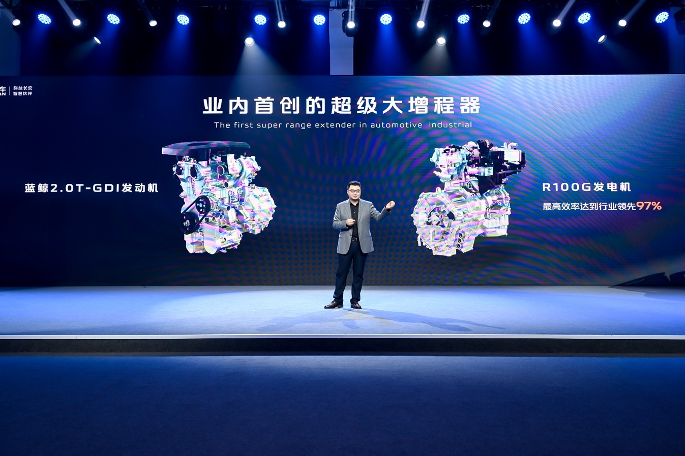 长安猎手最大的杀手锏,就是业内首创的超级大增程器,由蓝鲸2.0T发动机和R100G发电机构成,其中发电机最高效率达到行业领先97%,来解决重载爬长坡等特殊路况导致的整车动力不足问题。