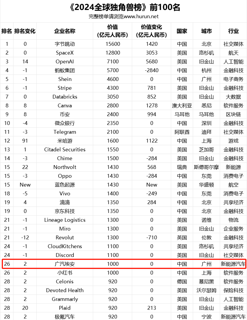 近日,全球权威商业机构胡润百富发布了备受瞩目的《2024全球独角兽榜》。这份揭示年度最具投资价值企业的榜单,全球十大独角兽中国占四席,中国十大独角兽中五个来自广东。其中,广汽埃安凭借千亿市值连续第二年稳坐全球最大“独角兽”新能源车企的宝座,其排名较去年提升3位,跻身至全球第25名、中国第10名。