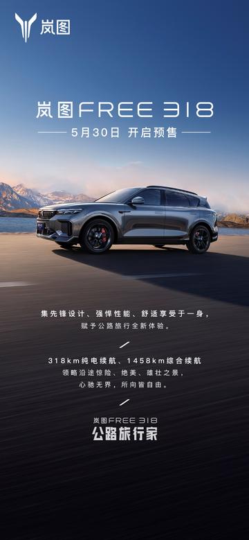 【2024年5月23日】5月23日,东风公司旗下高端新能源品牌岚图官方宣布了今年第一款上新车型,岚图FREE 318,并预告将于5月30日启动该车型的预售。岚图FREE 318是在现款岚图FREE的基础上,围绕包括外观、续航、性能、智能、安全在内多维度焕新升级,是一款名副其实的“公路旅行家”。