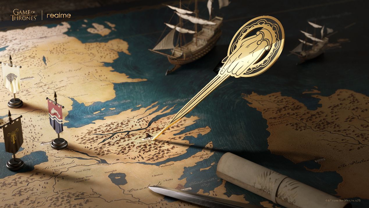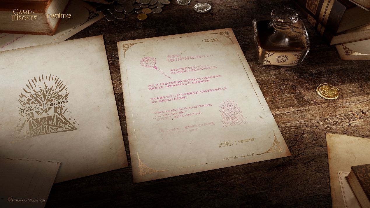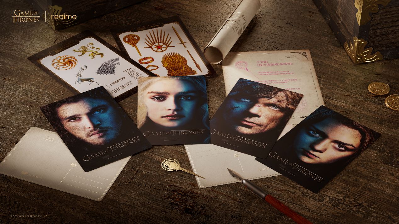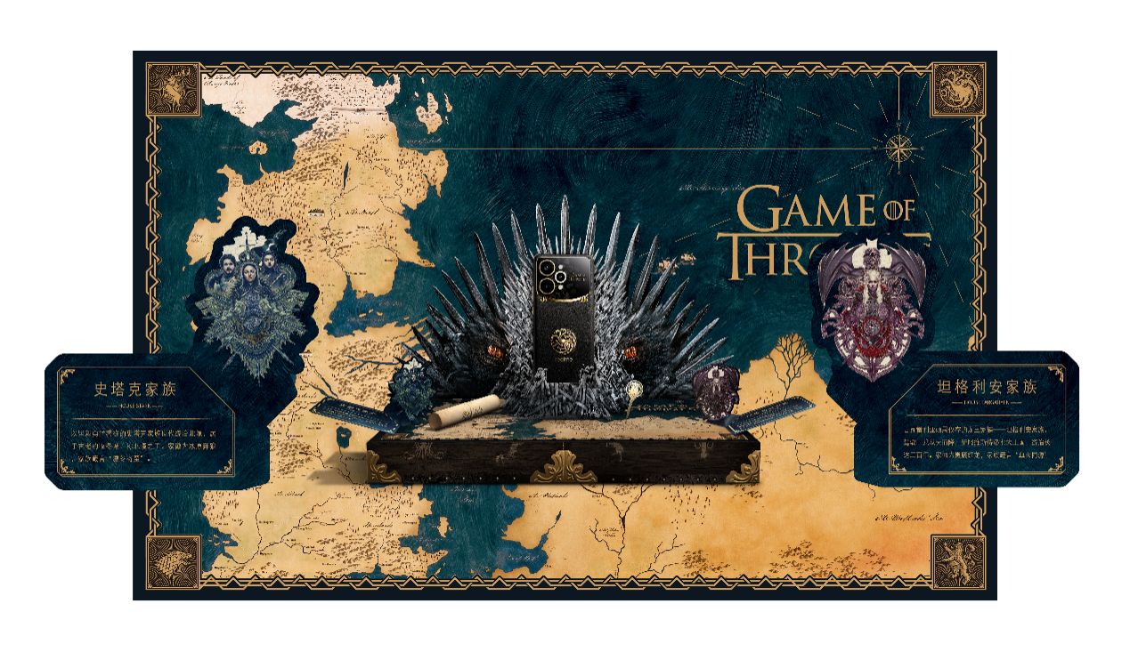 在礼盒周边设计上,真我深度结合原作经典符号,让每一项配置都极具收藏价值。礼盒外观灵感源自丹妮莉丝·坦格利安的龙蛋木盒,以鎏金雕刻纹理呈现,融合质感胡桃木纹理与金属装饰,表面镌刻九大家族徽章,尽显中世纪皇室的厚重感。开启礼盒,便是开启一段荣耀征程,内部直指维斯特洛大陆的最高权力图腾——以立体铁王座造型打造的手机支架,底部复刻完整的维斯特洛大陆地图,让每一次放置都充满仪式感。