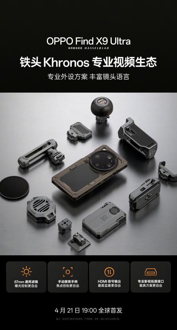 2026 年 4 月 20 日,中国・深圳 —— OPPO 今日正式官宣 「口袋电影机」 Find X9 Ultra 视频能力全面跃升,不仅以全大底专业视频镜头组,为创作者提供焦段自由与构图自由;更首发全新O-Log2,融入专业log创作工作流,让每一帧光影都更有层次;并首发原生支持 3D LUT 导入与烧录,一键直出电影感。OPPO 更与全球专业影视配件品牌 TILTA铁头,共同打造专属 Find X9 Ultra 的「铁头 Khronos 专业视频生态配件套装」,为移动影像视频创作开启专业级全新可能。