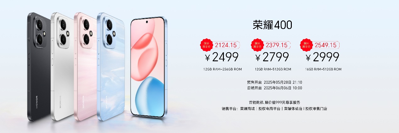 2025年5月28日,荣耀正式发布2亿超清写真人像荣耀400系列手机,平板新形态产品荣耀平板10,以及首发健康能量评估功能的荣耀手表Fit。全新智能手表荣耀手表Fit,通过时尚轻薄的外观设计、首发健康能量值、萌宠主题表盘以及丰富的AI功能体验,为用户带来“超好玩的能量小圆表”。新品于5月28日正式发售,国补到手价424.15元起。
