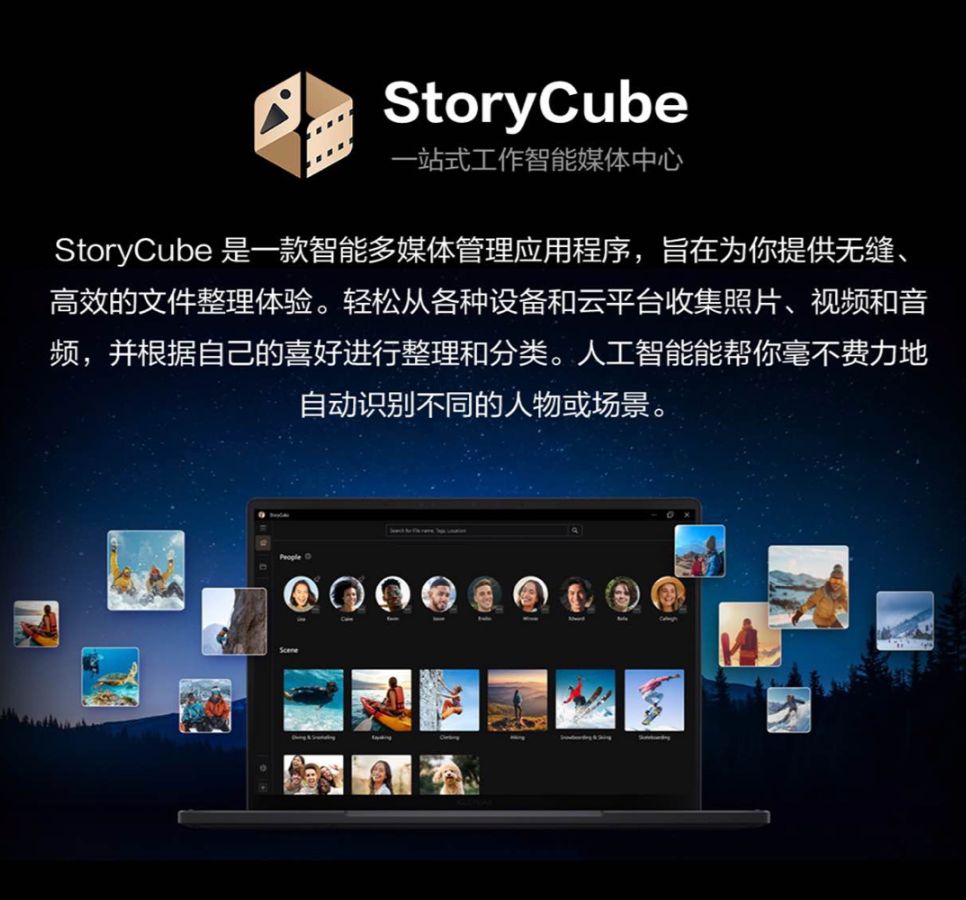 为提供无缝、高效的文件整理体验,它还搭载StoryCube一站式工作智能媒体中心,可轻松汇聚多设备、多云平台的照片、视频与音频素材,并根据用户喜好进行整理和分类;更依托人工智能技术,实现画面中人物、场景的自动识别,轻松完成素材归类。无论是商务场景下的方案制作,还是生活中的旅行影像回顾,轻松实现更高效、更具质感的创意表达与记忆分享。