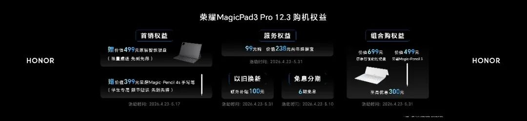 荣耀MagicPad3 Pro 12.3现已在荣耀商城、授权电商平台、荣耀体验店、授权零售门店等官方销售渠道开售,4月23日至5月17日期间,购买荣耀MagicPad3 Pro 12.3限时赠送价值499元原装智能键盘、学⽣认证送价值399元荣耀Magic-Pencil 4s手写笔;4月23日至5月10日期间,享6期免息分期;4月23日至5月31日期间,99元购价值238元2年碎屏宝、以旧换新补贴额外补贴100元,组合购原装智能触控键盘和荣耀Magic-Pencil 3触控笔⾄⾼优惠300元等福利权益。所有福利,数量有限,先到先得。荣耀MagicPad3 Pro 12.3国补优惠价3499元起。