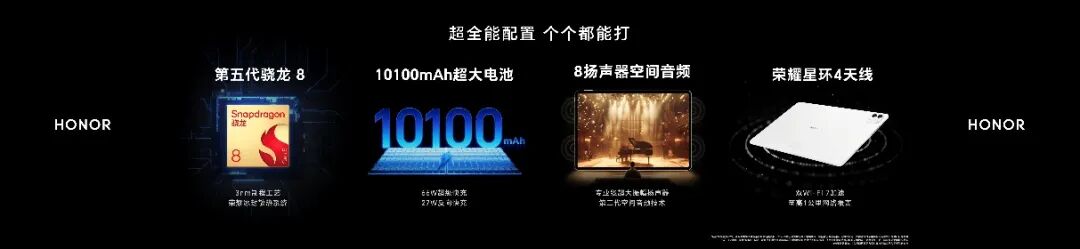 荣耀MagicPad3 Pro 12.3搭载第五代高通骁龙8旗舰芯片,配合荣耀冰封散热架构,实现满血性能稳定释放,高效平衡性能功耗,为多任务处理、视频后期、AI运算、3A游戏运行提供强劲性能;内置10100mAh超大电池,支持66W超级快充、27W反向充电,不仅告别续航焦虑,还能为iPhone等其他系统设备充电;荣耀自研星环四天线,支持双Wi-Fi7加速,实现一公里超远距网络覆盖;八扬声器与第三代空间音频技术加持,进一步拓展了娱乐、学习等使用场景,结合全维度软硬件生态融合,覆盖用户使用痛点,打造全场景极致体验。